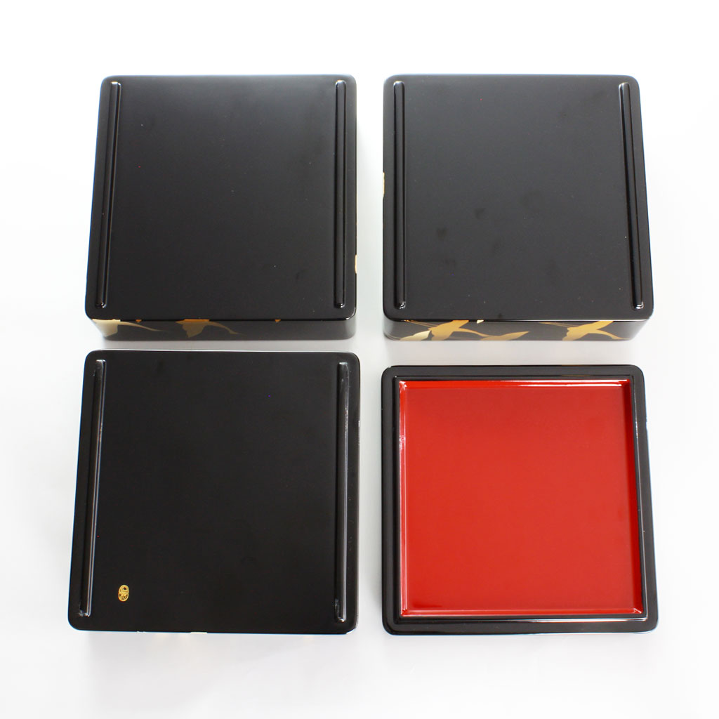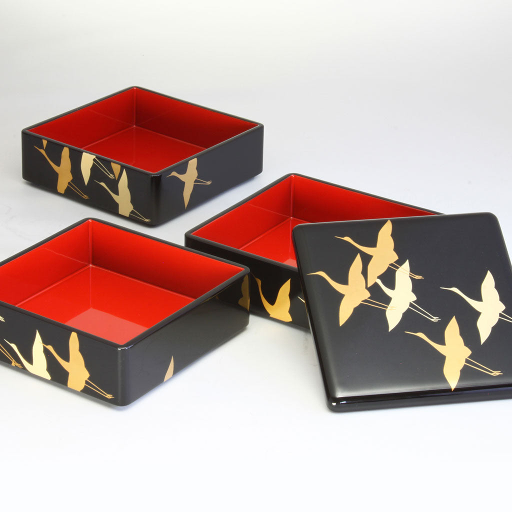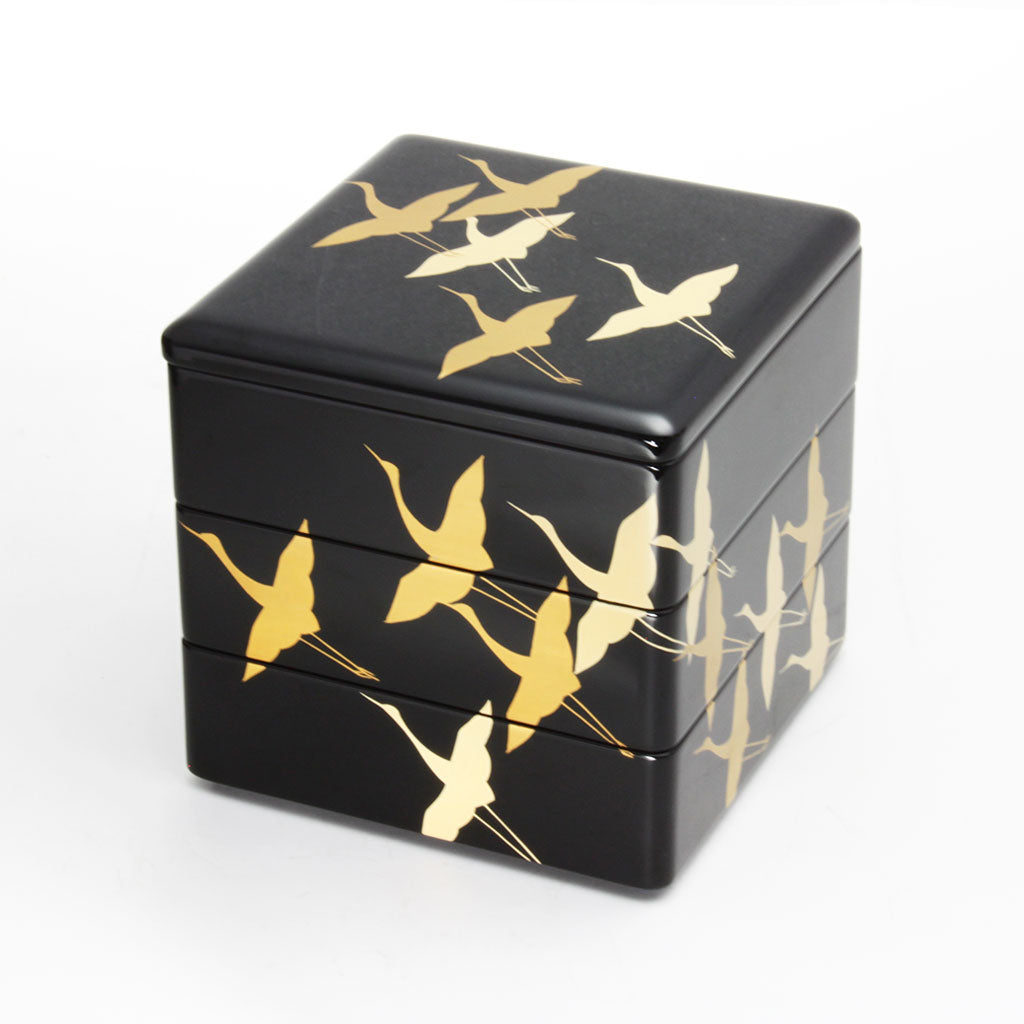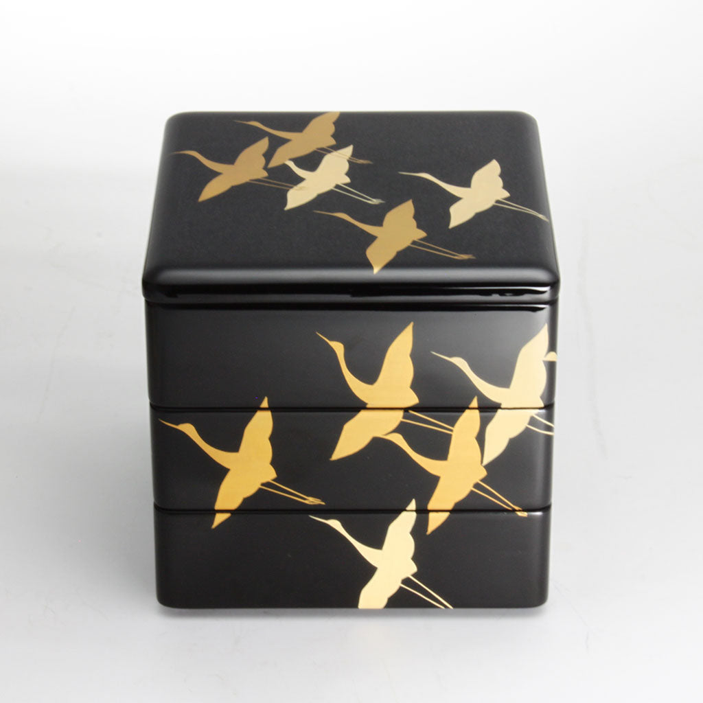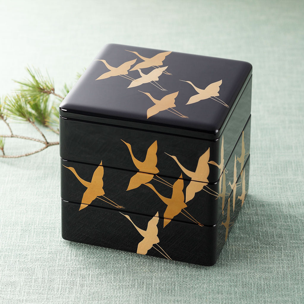 艶のある黒漆に金と色漆で千羽鶴を描いた伝統美にあふれる三段重です。