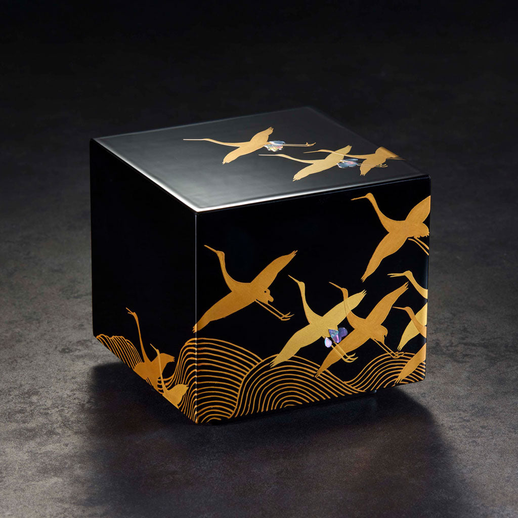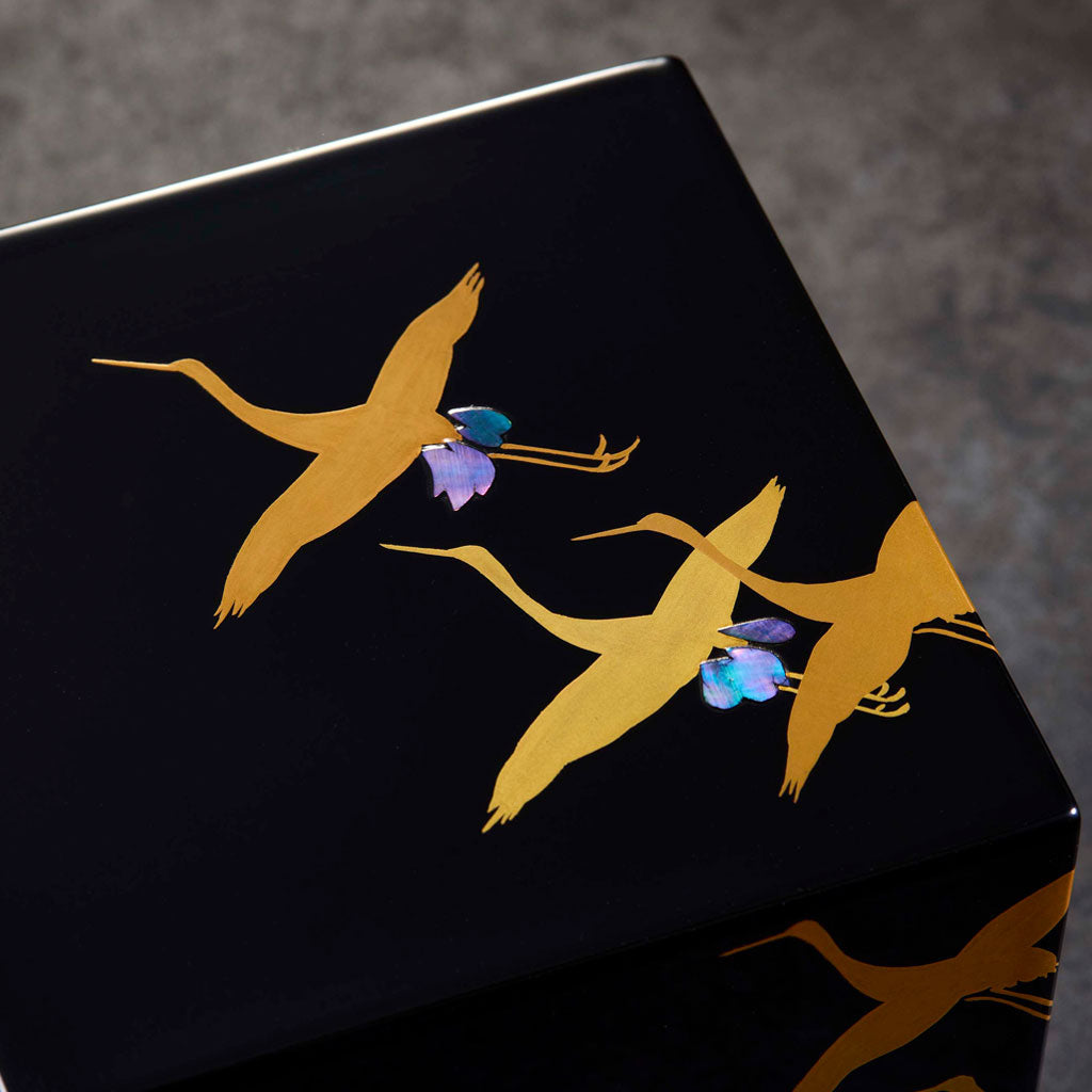 艶のある黒漆に金蒔絵で鶴を描き、尾羽にきらりと輝く螺鈿も見どころのひとつです。