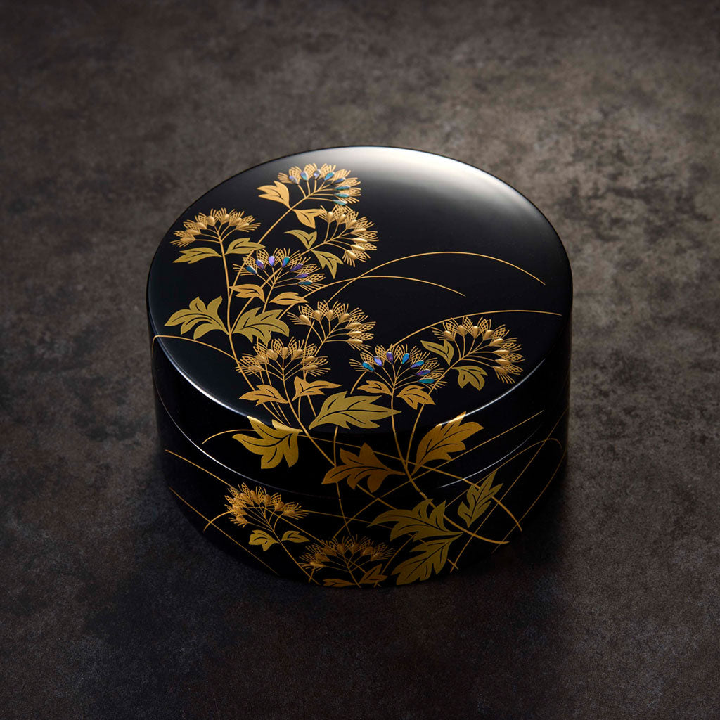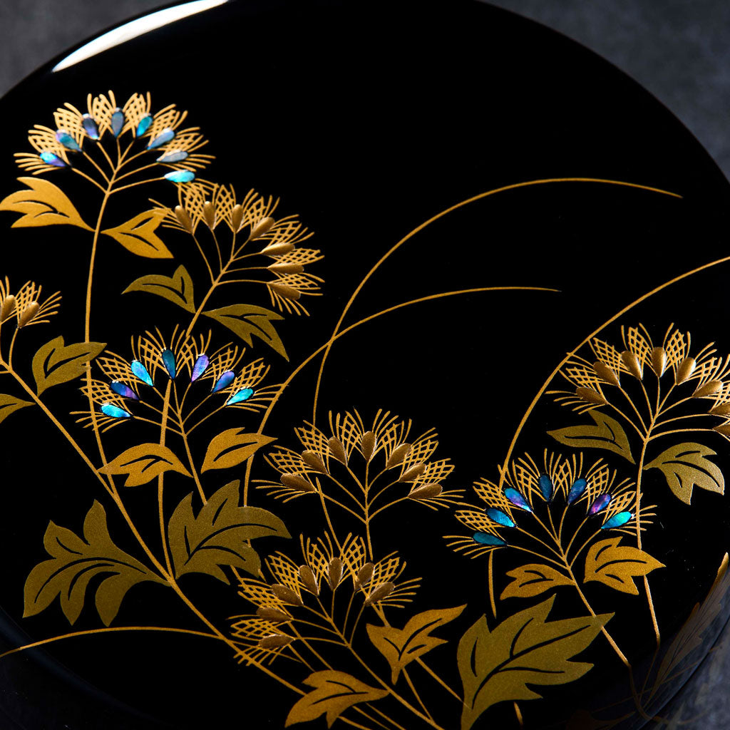 可憐に咲く藤袴をきらめく貝を散りばめて描き、京蒔絵の美しさ、技術の高さを堪能できる格調高い飾箱に仕上げました。
