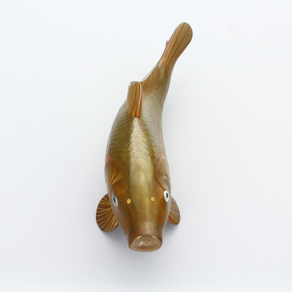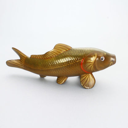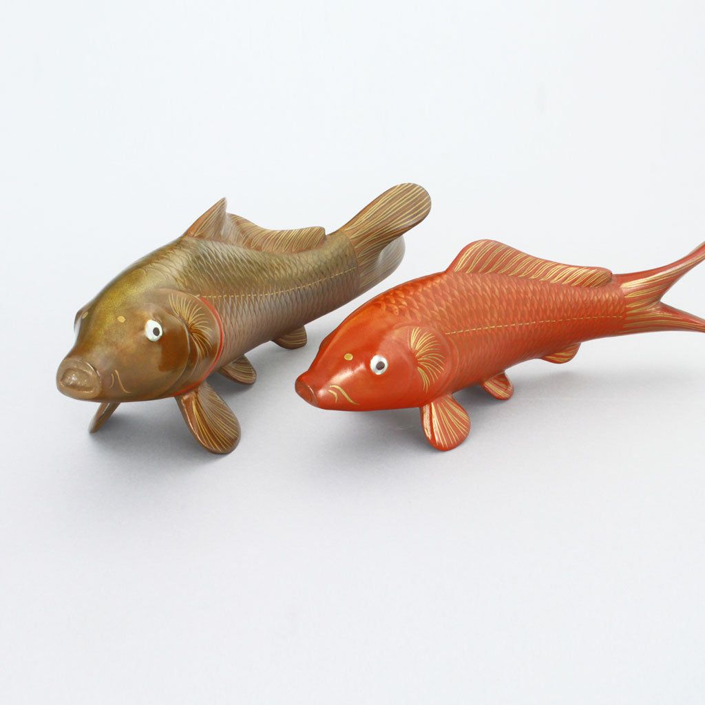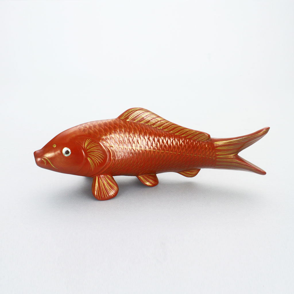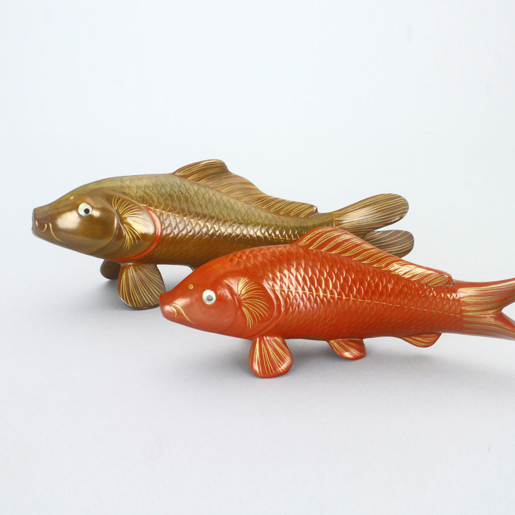 金色の真鯉は金の黒固め、紅色の緋鯉は朱金の技法を用いて、上品な質感に仕上げました。