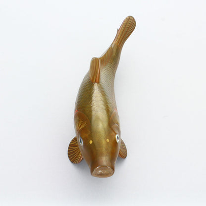 目には螺鈿がきらりと光り、動きのある泳ぎ姿の置物です。